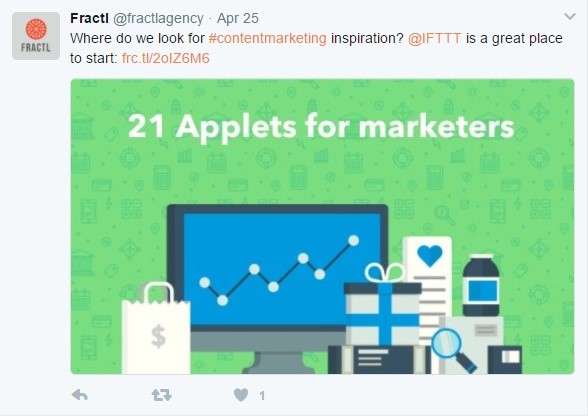 Социальные сети. Отмечая людей в постах, вы сможете извлечь выгоду из социального окружения пользователей. Например, недавно ребята из команды Fractl написали блог-пост о том, где они черпали вдохновение для создания контента. Для продвижения в социальных сетях они отметили в статье все инструменты, которыми пользовались, например IFTTT: